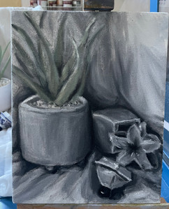 I’ve finished my grisaille painting, and I’m really happy with how it turned out. The values in the leaves could use a little more work, and the lid of the vase is just a bit off, but overall, I’m pleased with it. I’ve started adding the first layer of color with glaze, and while the color is pretty close, it will need more layers and a bit more color to look more accurate. I am very happy with this piece and super excited to move forward :)